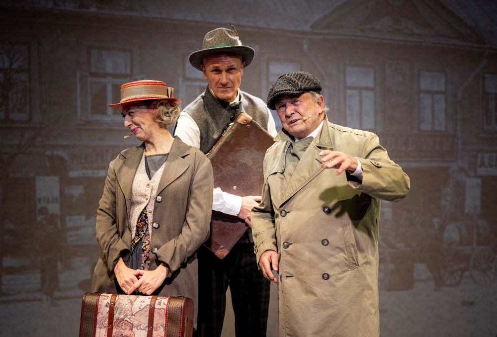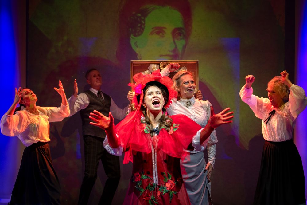 Kobieta w ubraniu vintage i czerwonym kapeluszu klęczy na scenie obok dwóch starych walizek, patrząc nieco poza kamerę, z neutralnym tłem i dużą białą kolumną za nią.
